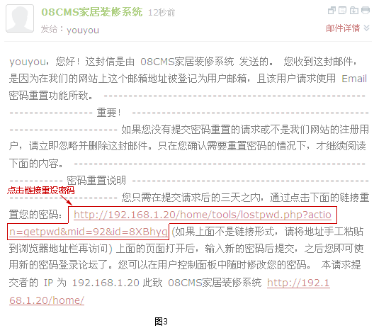 步骤三、提交完毕后,就会系统就会将相关信息发送到您的邮箱,其中就是让您重设密码的链接(如图3所示),点击链接就会跳转到重设密码的页面,填写好自己所需密码方可