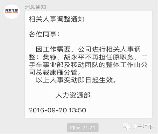 9月22日消息,据汽车之家内部人士透露,9月20日,汽车之家再次有了新的人事变动,汽车之家联合创始人樊铮、汽车之家二手车事业部总经理胡永平被辞掉职务。