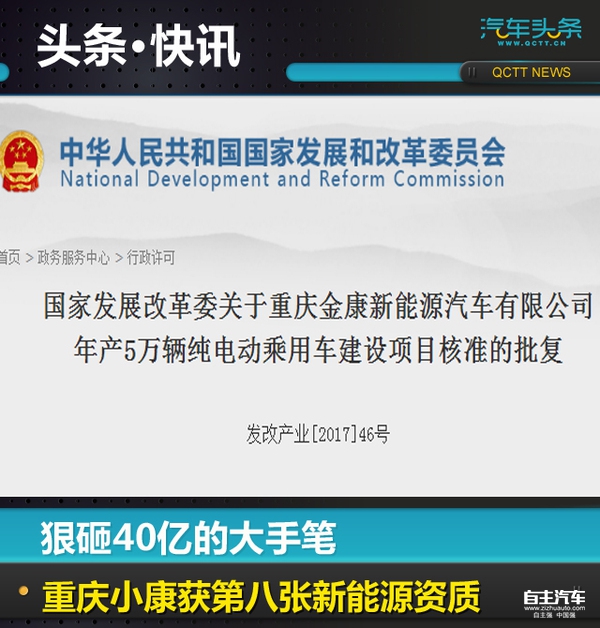 1月10日,发改委发布重庆金康新能源汽车有限公司年产5万辆纯电动乘用车建设项目核准批复,这意味着,继北汽新能源、长江汽车、长城华冠、奇瑞新能源、敏安汽车、万向集团、江西江铃之后,重庆金康成为第八家获得新建纯电动车生产资质的企业。
