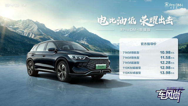 宋Pro DM-i荣耀版共推出5款车型,官方指导价10.98万元——13.98万元,重新锚定A级SUV市场新价值,在该细分市场正式拉开“电比油低”大幕!